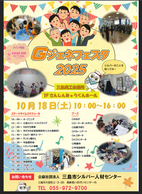 三島市シルバー人材センター主催の「Gジェネフェスタ2025」が、10月18日(土)10時から16時まで、三島商工会議所1階さんしんみゅうくんホールで開催されます。