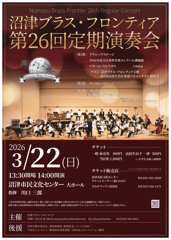 3月22日、沼津市民文化センターにて「沼津ブラス・フロンティア」の定期演奏会が開催されます。コンクール課題曲から、ディズニー、懐かしの「平成魔女っ子伝説」まで、吹奏楽の魅力が詰まったステージです。