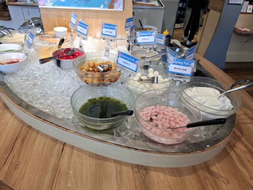 完成しているものではなくゼリーやアイス、フルーツ、ソースなどのトッピングが用意されており、自分たちでオリジナルのパフェを作ることができます!