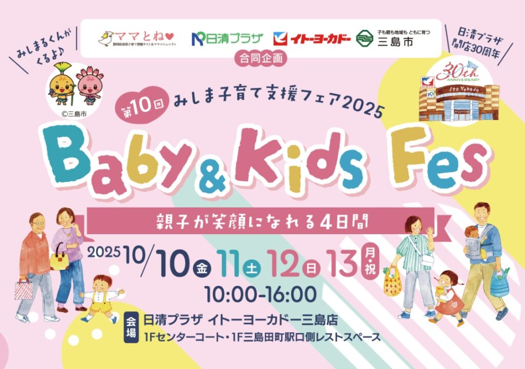 10月10日(金)から13日(月・祝)までの4日間、日清プラザ イトーヨーカドー三島店で第10回 みしま子育て支援フェア2025『Baby&Kids Fes』が開かれます!