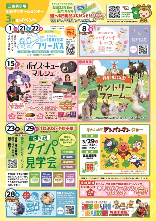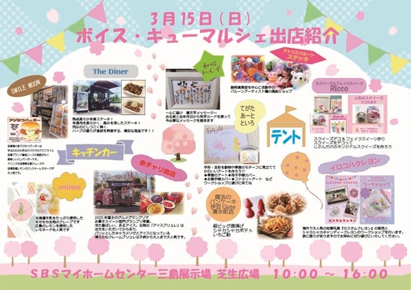 今年も開催が決まりました!これまでと同様、SBSマイホームセンター三島展示場で、3月15日日曜日に「ボイス・キューマルシェ」を開催します。時間は10時から16時。ステージではダンスチームやお笑い芸人、音楽アーティストが登場!もちろん公開放送もありますよ!!モデルハウスの見学でクッキーやギフト券のプレゼント。キッチンカーやテント出店では食べたり、楽しんだり。同時開催の移動動物園カントリーファームでは可愛い動物に触れあえます。春の1日を「ボイス・キューマルシェ」でお過ごしください。